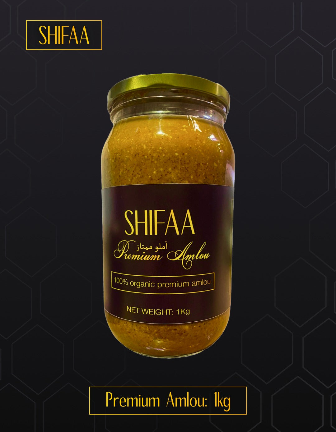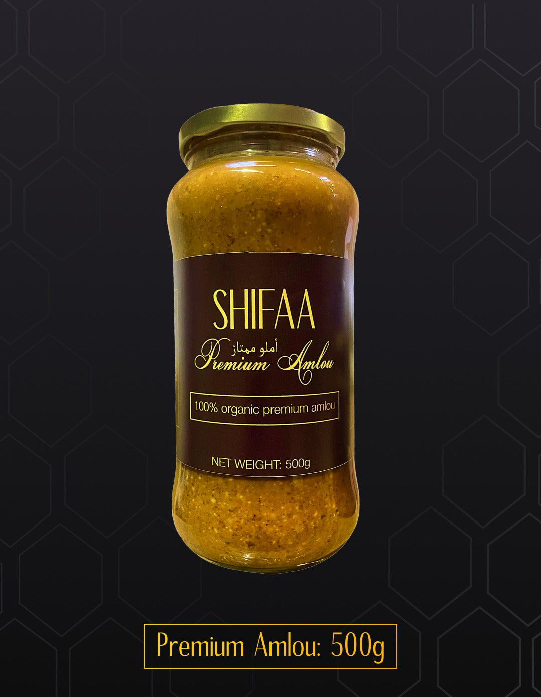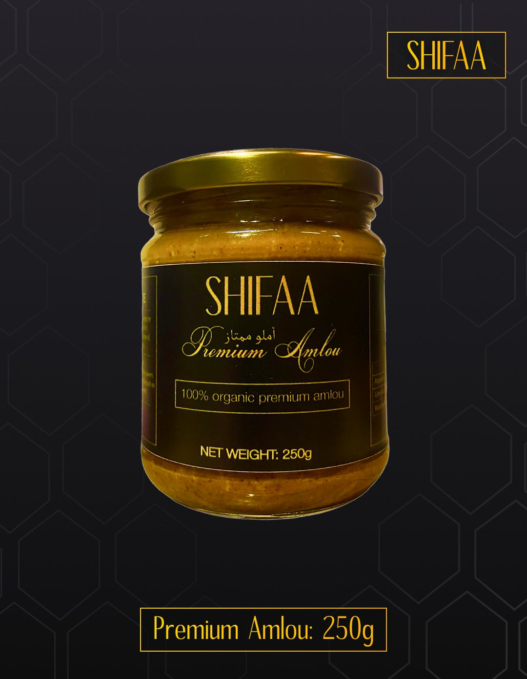Amlou komt uit de regio's van Zuid-Marokko, waar de amandelen en arganbomen in overvloed groeien. Arganolie, het belangrijkste ingrediënt wordt al eeuwenlang gewaardeerd in Marokko vanwege zijn vele gezondheidsvoordelen. Amlou wordt met de hand gemaakt door de amandelen te roosteren, waardoor ze worden gemalen en gemengd met de waardevolle arganolie en honing, wat resulteert in een heerlijke, romige pasta