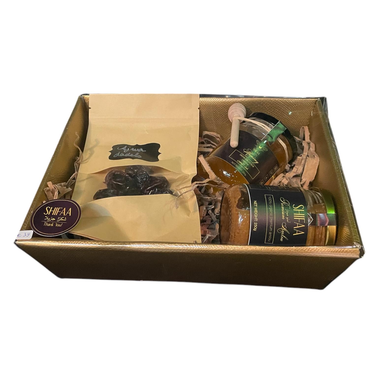 Cadeaugeschenk ( gouden doos) Dit cadeaugeschenk bevat een honingsoort en een smaakvolle Amlou.